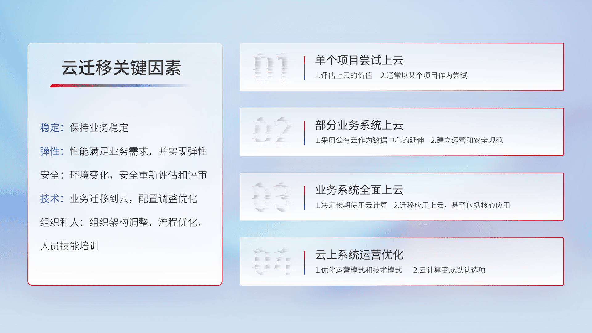 结合实际业务,,从规划设计、、云平台选型、、、云原生改造、、、数据迁移、、、、集成交付,,,迁移全过程为客户识别最佳上云路径,,做好风险识别管理,,,,设计网络架构、、身份权限、、、、安全审计合规、、、操作审计、、日志审计、、、、监控告警策略、、、、多站点容灾设计等,,,,对云上基础设施进行整体规划,,,,提升IT治理水平,,以满足弹性、、、、高可用、、、高性能的需求。。。