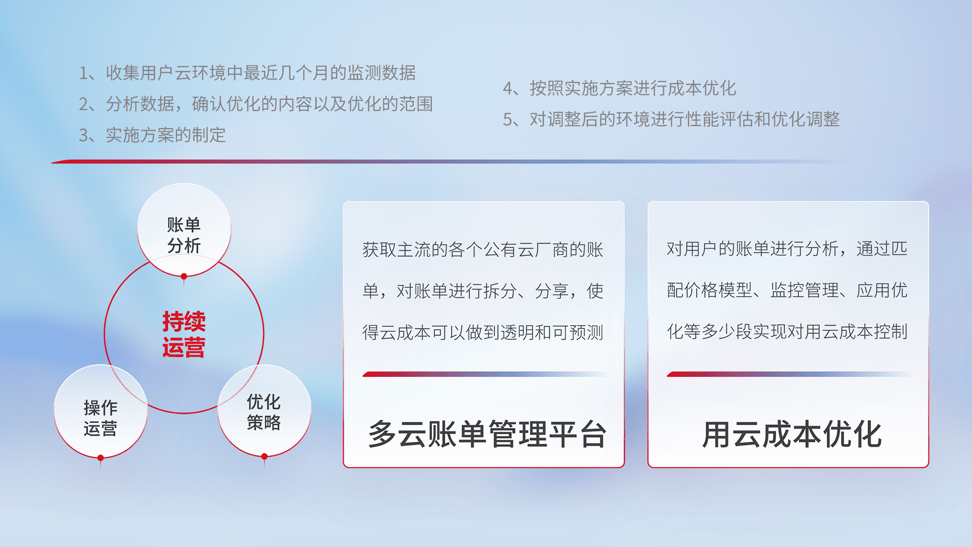 通过多云纳管,,,以统一的资源数据模型把客户的云资源进行抽象和封装,,,,进而实现对多云资源的统一操作,,保障云资源管理的可靠性、、稳定性与可用性。。。。量身定制化运维内容,,,配置、、开发运维、、补丁管理、、、备份、、、、监控、、认证和访问管理、、、审计和日常巡检等,,,保障在用云过程中的可靠度,,,,稳定度以及高可用率。。。